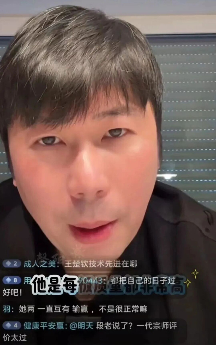 继在直播中说孙颖莎和王曼昱正互相研究后,找到流量密码的德国华裔削球名将韩莹的丈夫雷洋再谈国乒运动员,将其目光投向更具流量和争议性的国乒头号主力王楚钦。
